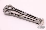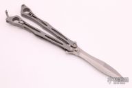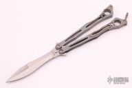 This Spyderfly Balisong by Spyderco features a satin finished spear point VG-10 blade with a false top edge. The handles are bead blasted stainless steel with a tip up clip (4-way reversible). Has a few light scuffs, otherwise excellent condition.