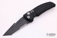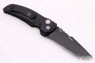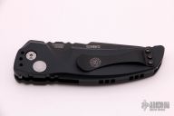 This EX-A01 by Hogue Knives is an Allen Elishewitz design, it features a black tanto partially serrated 154CM blade with notched thumbrest. The handle is black aluminum, tip up or down reversible black stainless steel clip. Has safety. Comes with Hogue box and papers. Excellent condition.