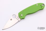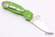 This Para 3 by Spyderco features a satin finished clip point blade with thumb hole and notched thumbrest. The handle has green G-10 scales over nested steel liners and stand-offs. The steel pocket clip is 4 way adjustable. Includes original box and papers. Excellent condition.