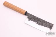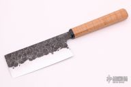 This custom Nakiri by Nate Summers features a hand forged blade with hidden tang construction, .134" Blade Stock and 2.2" Blade Depth. The handle features a curly maple grip with a black canvas micarta ferrule. New from maker!