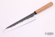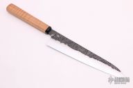This custom santoku by Nate Summers features a hand forged blade with hidden tang construction, .120" Blade Stock and 1.6981" Blade Depth. The handle features a curly maple grip with a black canvas micarta ferrule. New from maker!