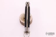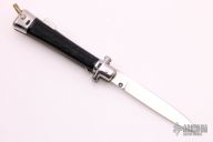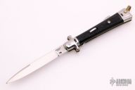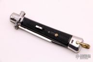 This Automatic by Bargeon features a mirror finished drop point blade with swedge. The handle has stainless steel bolsters and pommel with checkered plastic scales over coin edged brass liners and stainless steel lockbar. Push button release, sliding safety and brass lanyard bail. Has a few light scratches, otherwise excellent condition.