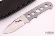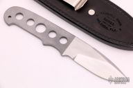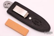 The Triathlete is a non-catalog knife. .161" blade stock and 1.042" blade depth, integral construction. Notched thumbrest. Bead blast handle. Comes with black leather sheath with belt clip and original paper wrapping. New from maker.