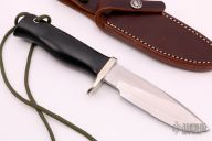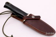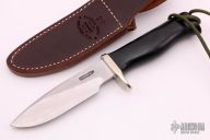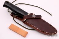 The Model 28 by Randall Made Knives is an excellent skinning and outdoors knife. Has a satin finished drop point blade with false top edge and notched thumbrest, .165" blade stock and 1.159" blade depth, full tang construction. The handle has a nickel silver guard, black linen micarta handle and a lanyard hole at the butt. Comes with a brown leather sheath and original paper wrapping. New from maker.