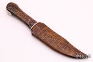 This knife by Master Smith Jay Hendrickson features a mirror finished blade with a false top edge, hidden tang construction with .199" blade stock and 1.277" blade depth. The handle has a nickel silver guard and butt plate, curly maple handle with silver wire inlays and copper pin inlays. Includes a matching curly maple sheath with silver wire inlays and copper pin inlays, stamped 2007 and is also stamped "5160". Excellent condition.