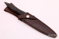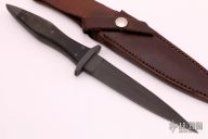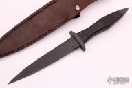This custom dagger by Pat Crawford features a black bead blasted double edged blade, .241" blade stock and 1.042" blade depth, full tapered tang construction. The handle has a black bead blasted stainless steel guard and rear bolsters, and black linen micarta scales. Comes with a brown leather sheath. Has a few light scuffs, otherwise excellent condition.