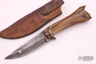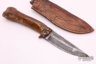 This hunter skinner by Miles Martin features a Damascus blade with a hidden tang construction.  .149" Blade Stock.  1.39" Blade Depth.  The handle features a cast copper guard and a fossilized horse leg bone.  Includes a brown leather sheath.  New from maker!