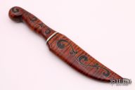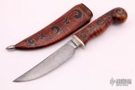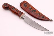 This knife by Master Smith Jay Hendrickson features a Damascus blade with a false top edge, hidden tang construction with .201" blade stock and 1.153" blade depth. The handle has a nickel silver guard, curly maple handle with silver wire inlays. Includes a matching curly maple sheath with silver wire inlays. Excellent condition.
