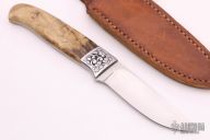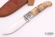 This hunter by Elrod features a hand rub satin finished blade with .158" blade stock and 1.061" blade depth, full tapered tang construction. The handle has engraved and dovetailed stainless steel bolsters, California Buckeye Burl scales and nickel silver pins. Comes with a brown leather sheath. Has a few light scratches, otherwise excellent condition.