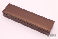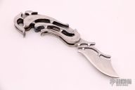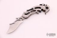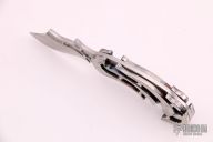 This custom slipjoint by Hidetoshi Nakayama features a hand rub satin finished blade with carved spine. The handle is textured and carved stainless steel with a stainless steel spring. Has half-stop, flush in all positions. Comes with original box and COA dated 9-21-2018. Also comes with a nice burlwood display stand. Excellent condition.