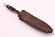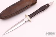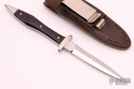 This Boot Knife by Pat Crawford features a mirror finished double edged blade with .175" blade stock and .575" blade depth, full tapered tang construction. The handle has nickel silver guard and rear bolsters, black linen micarta scales with red liners and nickel silver pins. Comes with a brown leather sheath with a clip. #5 on the blade. Has a couple light scratches, otherwise excellent condition.