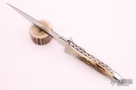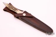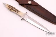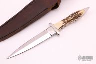 This Assassin Dagger by Pat Crawford features a mirror finished double edged blade with .237" blade stock and 1.046" blade depth, full tapered tang construction. The handle has nickel silver guard and stainless steel rear bolsters, stag scales with red liners and nickel silver pins, has a fully fileworked tang. Comes with a brown leather sheath with a belt loop, I don't think it is the original sheath. #18 on the blade. Has a couple light scratches, otherwise excellent condition.