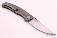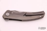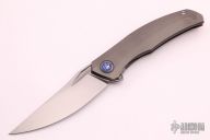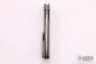 This Quantum by Shirogorov features a blasted blade with notched thumbrest and flipper. The handle has a blasted and milled titanium frame, backspacer, tip up titanium clip with hidden screws. Rides on MRBS, nice detent, lockup and blade seating. Comes with original box and COA. Excellent condition. Still has sticker on the pivot.