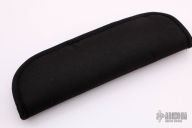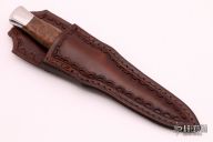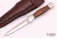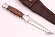 This Dagger by Don Lozier features a two-tone double hollow ground blade with mirror polished grinds and satin flats, mirror polished stainless steel dovetailed bolsters and amboyna burl scales with hidden pins, .157" blade stock and .730" blade depth, full tang construction. Very nice work. Comes with a hand tooled brown leather sheath and a zippered case. Excellent condition.