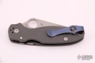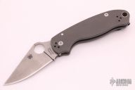 This Paramilitary Linerlock Folder from Spyderco has a tumble finished clip point blade with thumb hole and notched thumbrest. Handle is grey G-10 with stainless steel liners and an anodized titanium deep carry 4-way reversible clip. Has some scratches, has been resharpened, good user condition.