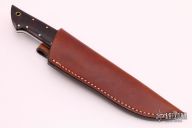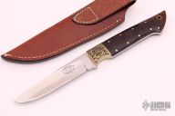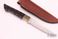This fixed blade by Jim Downs features a mirror polished drop point blade with .134" blade depth and .938" blade depth, full tang construction. The handle has engraved brass bolsters, wood scales and brass pins. Includes a brown leather sheath with belt loop. Has a couple small cracks in the scales, otherwise excellent condition.