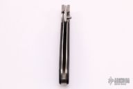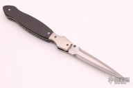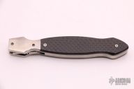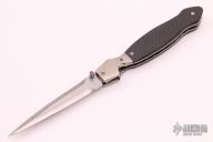 This linerlock folding dagger by Frank J Dilluvio features a double edged blade with a single thumbstud with ruby inlay. The handle has dovetailed titanium bolsters, carbon fiber scales, titanium liners and backspacer. Has some scratches, otherwise good condition. Comes with a zippered case. Dated 2005.