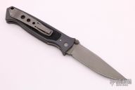 This Chameleon by Microtech is dated 3/96 and numbered 061.  The release button for automatic opening is under the end of the clip.  The blade features a bead blasted blade with dual thumbstuds and a notched thumbrest.  The handle features titanium scales with two rubber inlays and a titanium tip up pocket clip.  Scuffs and scratches are visible on the blade and handle otherwise the knife is in good working condition.