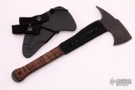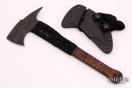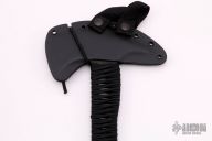 A combination tool developed for Military and Law Enforcement use, the WK Combat Axe is made for breaching and combat applications. The user has easy access with a fast draw carrier. An integral glass breaker extends beyond the end of the handle. The WK Hammer Combat Axe is basically the same axe as the WK Combat Axe, but with a hammer pole rather than a spike. It is a great woodcraft or field axe or performs well as a breaching axe when hammering is part of the operation. A partial cord wrapped upper handle option is available. If the handle is damaged under the head, a new cord can readily be installed. The cord is also an excellent emergency resource. Axe Specifications Axe steel: 80CrV2 Black oxide no-glare finish Head length: 5 7/8" Overall length: 13 3/4" Blade thickness: 3/8" Skeletonized full tapered tang Integral Glass Breaker Partial cord wrap optional Sheath Fast draw carrier Lined Kydex® HD shockcord quick-release retention system Nylon belt straps with Mil-Spec Pull-The-Dot™ snaps Designed for multiple carry options (See our Info page for carry options) Comes with original packaging. New from maker.