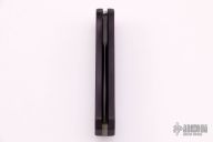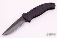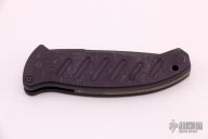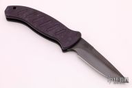 This Combat Auto by Woodard Knives has a gun blued blade with false top edge. Handle is black aluminum with milled contours and lanyard hole, green linen micarta backspacer. Scuffs/scratches are visible on the blade and handle otherwise the knife is in excellent condition.