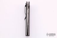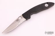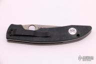 This AFCK liner lock folder from Benchmade has a spear point blade with partial serrations, thumbhole and a notched thumbrest. Handle is black G10 over titanium liners, black backspacer, lanyard hole. Black stainless steel tip down pocket clip. Has some light scratches, otherwise excellent condition.