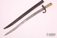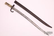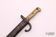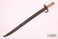 This French Model 1866 Chassepot Bayonet from St. Etienne Arsenal features a satin finished recurved blade with wide fullers. The handle is comprised of a steel guard/muzzle loop and brass handle over hidden tang construction. Inlaid steel locking mechanism secures the handle to the bayonet lug on a French Model 1866 Chassepot Rifled Infantry Musket. Includes metal scabbard. Scuffs on blade and patina on blade, handle and sheath, has some dings as well. This piece was manufactured in 1872.