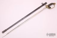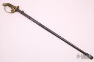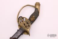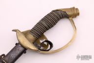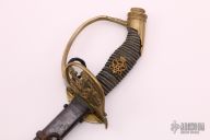 Authentic WWI German Prussian officer's sword with the original scabbard. The folding guard still folds and works. King Wilhelm's Cypher is present on the grip. The blade is still nicely polished but has some scratches. The grip is really nice on this sword with brass furniture and sharkskin grip with twisted wire. The scabbard screw is present and so is the ring. Has some scratches and patina, otherwise good condition for its age.