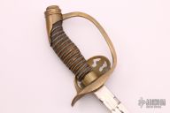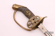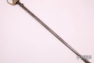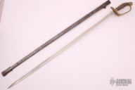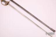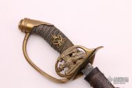 Authentic WWI German Prussian officer's sword with the original scabbard. The folding guard still folds and works. King Wilhelm's Cypher is present on the grip. The blade is still nicely polished but has some scratches. The grip is really nice on this sword with brass furniture and sharkskin grip with twisted wire. The scabbard screw is present and so is the ring. Has some scratches and patina, otherwise good condition for its age.