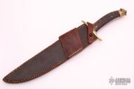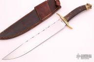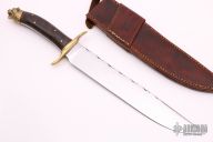 This bowie by Mark Paluch features a hand forged satin finished blade with fileworked spine, .213" blade stock and 1.635" blade depth, full tang construction. The handle has a fluted brass guard and tigers head pommel with stabilized walnut scales and brass pins. Comes with a brown leather sheath. New from maker.