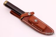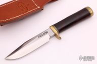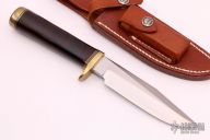 This Model 5-5 by Randall Made Knives features a satin finished clip point blade with a false top edge and a notched thumbrest, .238" blade stock and 1.116" blade depth hidden tang construction. The handle has a brass guard, a burl wood grip and a brass butt cap. Comes with a brown leather sheath.  Excellent Condition.