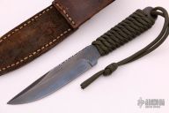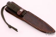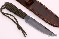 This knife by Mark Paluch features a hand forged and gun blued finish blade with sharpened top edge and fileworked thumbrest, .166" blade stock and .948" blade depth, full tang construction with paracord wrapped handle. Comes with a brown leather sheath. New from maker.
