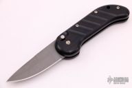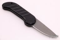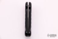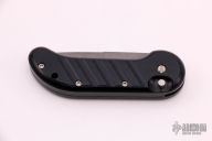 This Sterile Black Knife features a spear point bead blasted blade with false top edge. The handle has a black aluminum frame with lanyard hole. Has a couple scuffs, otherwise excellent condition.
