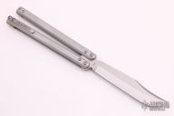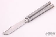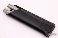 This Kratos Lite by Atropos features a satin finished blade. The handles are channel construction tumble finished aluminum with bronze spacers and a tip up stainless steel clip. Comes with original black leather sheath and box. Excellent condition.