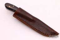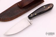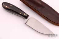 This knife by Mark Paluch features a hand forged satin finished blade with fileworked thumbrest, .175" blade stock and 1.142" blade depth, full tang construction The handle has buffalo horn scales with brass pins. Comes with a brown leather sheath. New from maker.