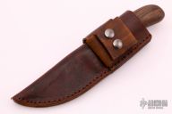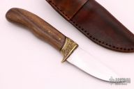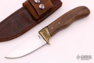 This knife by Mark Paluch features a hand forged satin finished blade with fileworked thumbrest, .158" blade stock and 1.099" blade depth, hidden tang construction The handle has a cast brass guard and an English Walnut grip with brass pins. Comes with a brown leather sheath. New from maker.