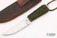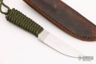 This knife by Mark Paluch features a hand forged and gun satin finished blade with .164" blade stock and .926" blade depth, full tang construction with paracord wrapped handle. Comes with a brown leather sheath. New from maker.