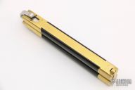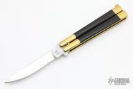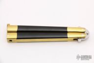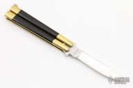 This Balisong features a satin finished blade ground by Jody Samson. The handle is comprised of integral dovetailed brass handles with black linen micarta inlays. Brass T latch on pommel. Has a couple small dings on the brass and some light scratches throughout, the knife is in good condition otherwise. Comes with a black nylon sheath.