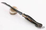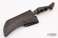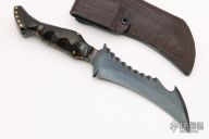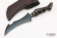 This "Dino Claw" by Aaron Schwartz features a gun blued hawkbill blade with nearly sharpened top edge and fileworked spine, .186" blade stock and 1.837" blade depth, full tang construction. The handle has buffalo horn scales with brass pins and fully fileworked tang. Comes with a leather over kydex sheath and a zippered case. One of the scales has separated from the tang slightly, has a crack in both scales at the pin closest to the choil, otherwise good condition.