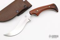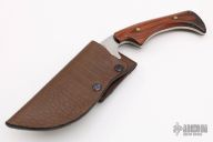 This Laci Szabo Designed Scimitar by David Mosier features a satin finished blade with notched thumbrest, .171" blade stock and 1.350" blade depth, full tang construction with laminated wood scales, mosaic pins and lanyard hole. Comes with a leather over kydex sheath and a zippered case. Has a few light scratches, otherwise excellent condition.