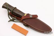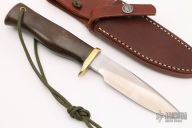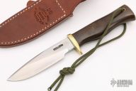 The Model 28 by Randall Made Knives is an excellent skinning and outdoors knife. Has a satin finished drop point blade with false top edge and notched thumbrest, stainless steel blade, .164" blade stock and 1.079" blade depth, full tang construction. The handle has a brass guard, black linen micarta handle and a lanyard hole at the butt. Comes with brown leather sheath and original papers. Has some light scratches on the blade and the micarta, otherwise good condition.