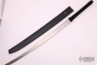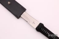 This Katana from Barry Dawson features a satin finished blade, .241" blade stock and 1.384" blade depth, full/hidden tang construction. The handle is comprised of black paracord Japanese style wrap over black canvas micarta. Includes a black leather sheath. Excellent condition. marked "001"