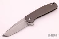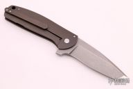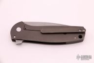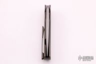 This Jasmine Flipper by Ray Laconico features a tumbled tanto blade with polished tip, swedge and flipper. The handle is comprised of tumbled and anodized titanium over a carbon fiber backspacer. Lanyard hole in pommel. The tumbled titanium tip up clip is positioned for tip up carry. Great blade seating, detent and lock up. Excellent condition.