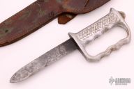 This Trench Knife features a spear point blade. The handle is comprised of cast aluminum over hidden tang construction. Lanyard hole in pommel. Includes leather sheath with belt loop. Has rust and patina and scratches, fair condition for its age. The leather on the sheath is old and a little brittle.