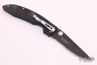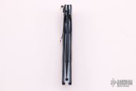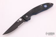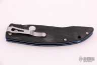 This Benchmade AFCK Limited Edition (142 of 250) linerlock folder has a black DLC M390 Stainless Steel clip point partially serrated blade with notched thumb rest and thumbhole. Handle is black G10 with anodized titanium liners, blue anodized titanium barrel spacers, lanyard hole, and tip down stainless steel clip. Excellent condition.