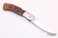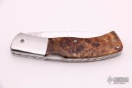 This Lockback by Charlie Dake has a mirror polished blade with fileworked spine, single nickel silver thumbstud. Handle has stainless steel dovetailed bolsters, burl wood scales with black liners, stainless steel liners and fileworked stainless steel backspacer. Nice blade seating and lockup. Has a few light scratches, otherwise excellent condition. "93168" on the ricasso.