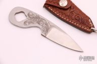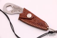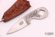 This neck knife by Lowell Bray features a satin finished blade with engraved flats, .189" blade stock and 1.013" blade depth, full tang construction. Comes with a hand tooled brown leather sheath. New from maker.