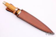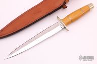 This Dagger by Harold Corby features a double edged mirror polished blade with .169" blade stock and 1.150" blade depth, hidden tang construction. The handle has a nickel silver guard and butt with yellow paper micarta grip, black and nickel silver spacers. Comes with a brown leather sheath. "01" on the ricasso. Excellent condition.