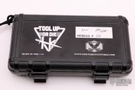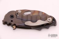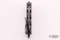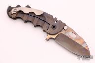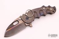 This P-O-W flipper by TS Heeter features a colored and tumbled blade with notched thumbrest, thumbhole and flipper, has a large fuller on the A-side. The handle has an anodized titanium frame with hammer marks, tip up reversible titanium clip, oxide finished CPM3V backspacer with some aggressive jimping and skull crusher. Has a stainless lockface insert. #226 on handle. Has an optional pin with split ring in the butt that can be used to lock the blade open, or it can be removed to reveal a lanyard hole. Nice detent, lockup and blade seating. Excellent condition. Comes with a case, COA dated 12/07/17.