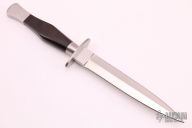This Dagger by Steve Fecas features a double edged hand rub satin finished blade, .222" blade stock and .929" blade depth, hidden tang construction. The handle is comprised of a stainless steel guard and butt, African Blackwood. Excellent condition.