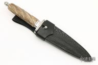 "I have always had a great interest in knives, even when I was a young boy growing up in Wisconsin. My dad gave me a knife that my grandfather made. I never got to meet my grandfather so that knife is very special to me. I first got started making knives in 1988 when a co-worker gave me a piece of tool steel from a saw to work. My brother told me that the knife that I made out of it looked like something made in a prison. I enjoy knifemaking because you are starting out with a chunk of steel and a chunk of ivory, and you hopefully end up with something of beauty. These are a few of the many makers that have inspired me: Buster Warenski, D'Holder, Dennis Freidly, Tim Hancock, and Don Norris. I prefer using Damascus steel because of the wide variety of beautiful patterns available. I like using natural materials for handles such as fossil Walrus, Mammoth ivory, and Mammoth teeth."